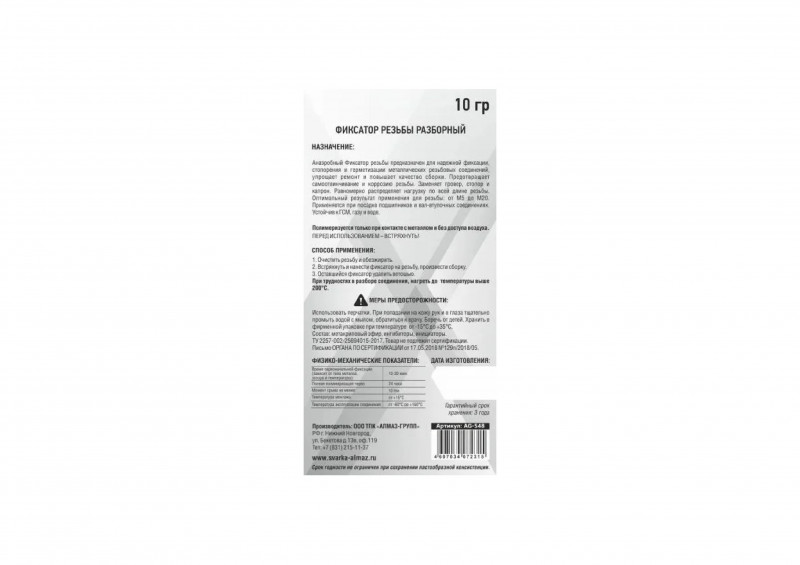 Герметик фиксатор резьбы АЛМАЗ РАЗБОРНЫЙ 10мл блистер- анаэробный герметик применяется для надежной фиксации металлической резьбы. Предотвращает самоотвинчивание и герметизирует соединения. Полимеризуется только при отсутствии воздуха и контакте с металлом. Характеристики: Время фиксации - 10-30 минут (в зависимости от вид