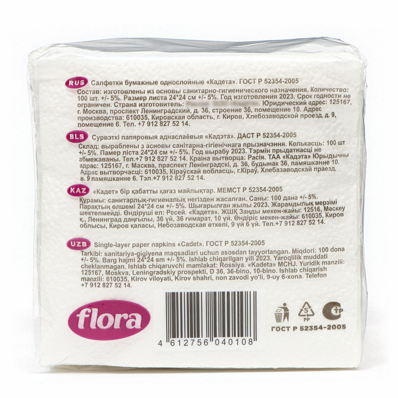 Бумажные салфетки изготовлены из основы санитарно-гигиенического назначения. Бумажное изделие складывается ¼. В упаковке 100 листов