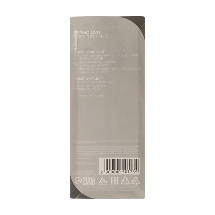 Термощуп кухонный TA-288 максимальная температура 300С батарейка LR44 белый