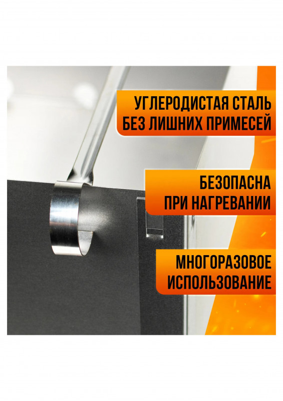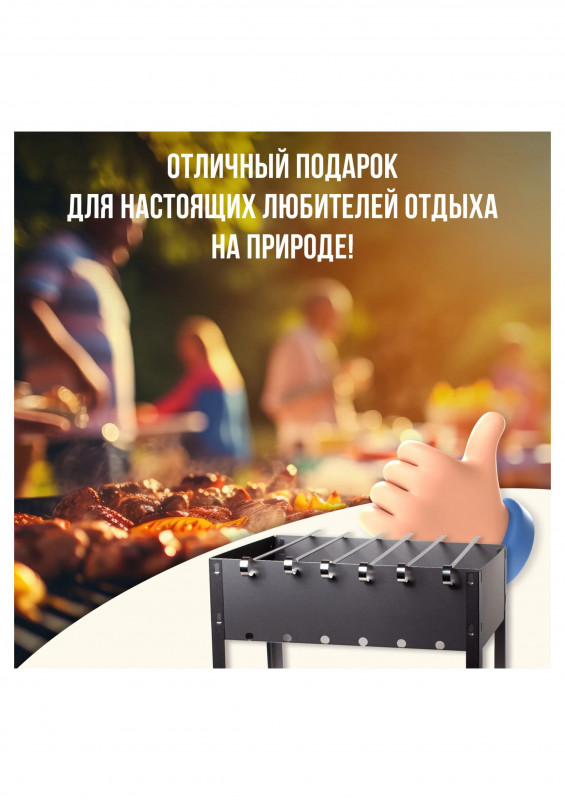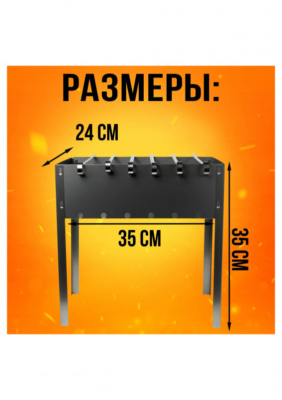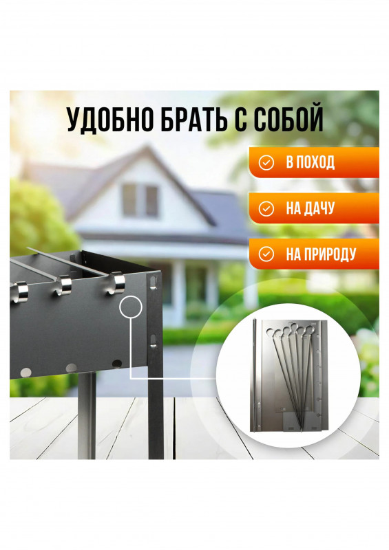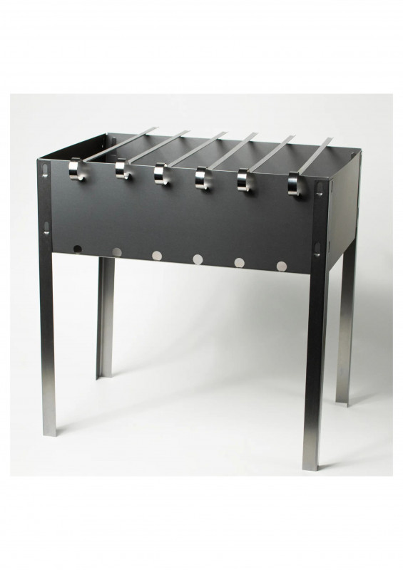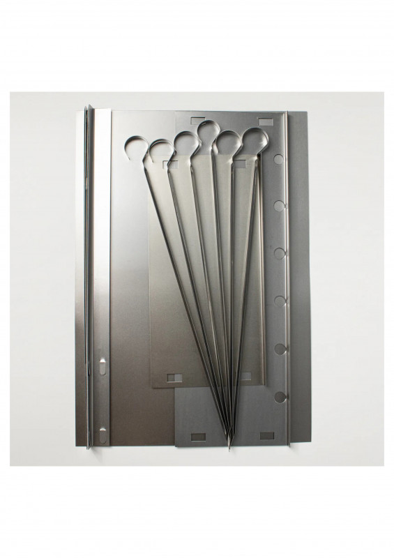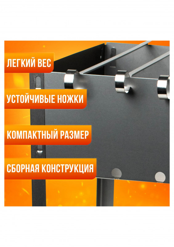 Изделие состоит из четырех боковых стенок прямоугольной формы, с крючками для сборки (отверстиями для сборки), прямоугольного днища и четырех угловых ножек (крючками для сборки) с отверстиями для сборки. В комплекте 6 угловых шампуров 370*10*0,5мм