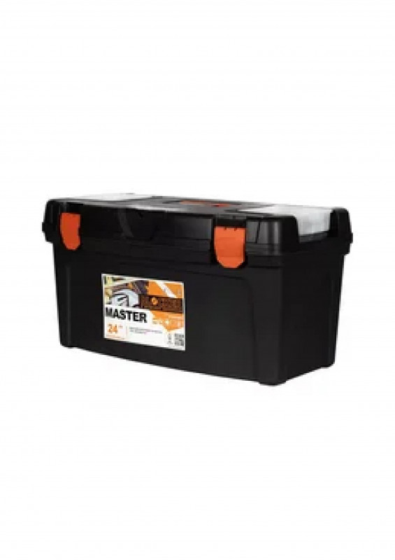 Чёрный/оранжевый ящик для инструментов Master 24 обладает большой вместимостью, которая позволяет расположить внутри необходимое количество ручного инструмента.Для хранения крепежа и различных мелочей есть объемные углубления.