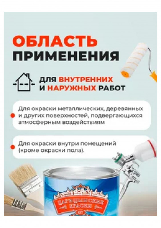 для окраски металлических, деревянных и других поверхностей, подвергающихся атмосферным воздействиям, и для окраски внутри помещений (кроме окраски пола).