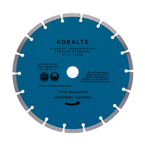 Алмазный диск "Kobalte", сегментированный, имеет параметры: диаметр 230 мм, посадочное место 22,23 мм, толщина диска 1,6мм, толщина алмазного слоя 2,4мм, высота алмазного слоя 10 мм. Изделие произведено из прочной стали, его поверхность поделена на сегменты, что улучшает качество резки и служит дополнительным охлаждением. Используется для сухой резки гранита, мрамора, керамики, бетона и других материалов.