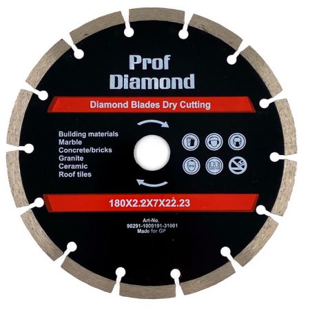 Алмазный диск "Prof Diamond" диаметр 180 мм, посадочное отверстие 22.23 мм, высота режущей кромки 7 мм, толщина диска 2.2 мм. Режущая кромка разбита на сегменты с компенсационными отверстиями по всей окружности. Диск выполнен из высококачественной стали и эффективно работает без принудительного охлаждения алмазного слоя. Применяется при работах с УШМ для сухой резки бетона, гранита, кирпича, камня и др. строительных материалов.